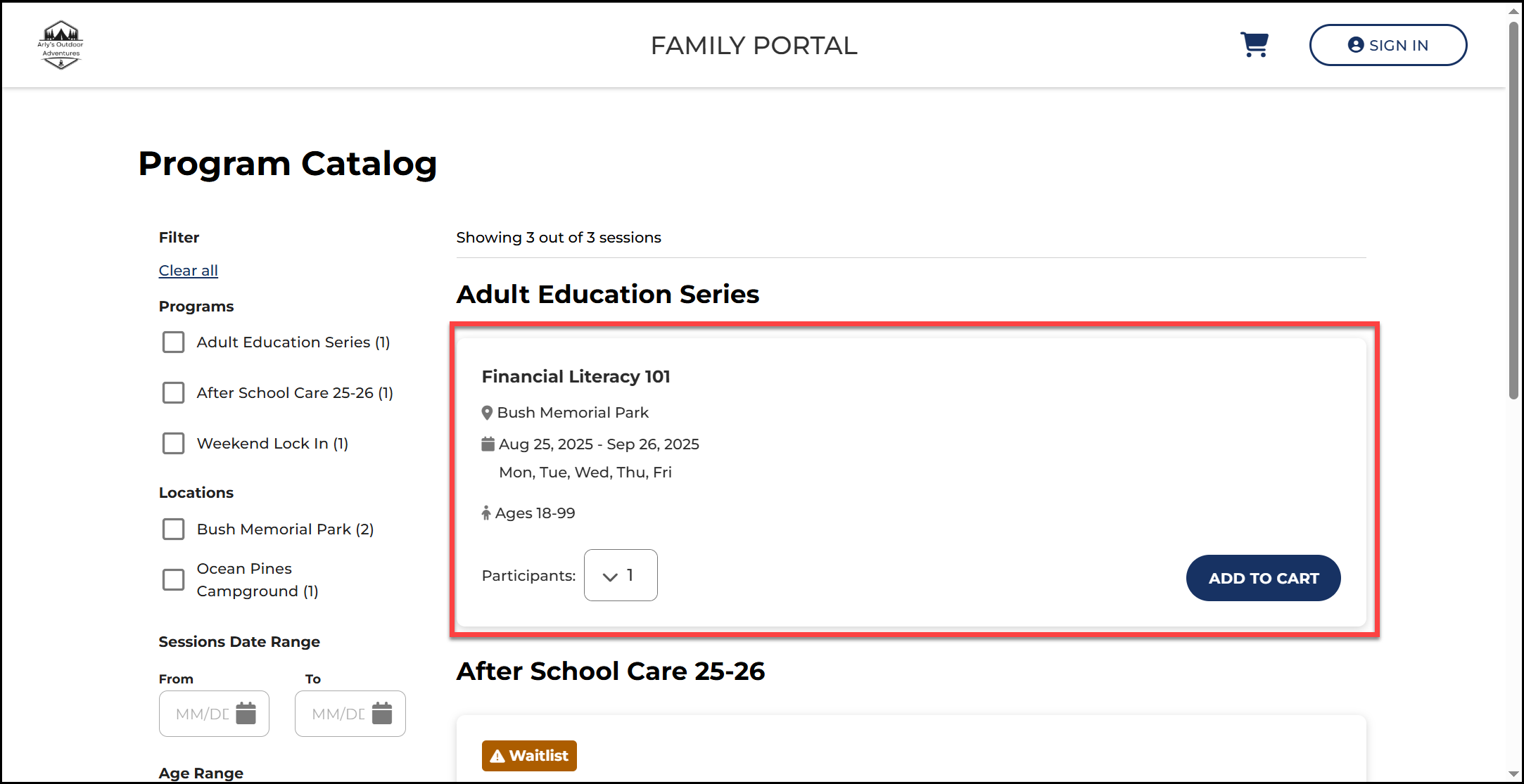 2. Browse the program catalog. Use the filters on the left to filter by Program, Location, and Session Date Range.